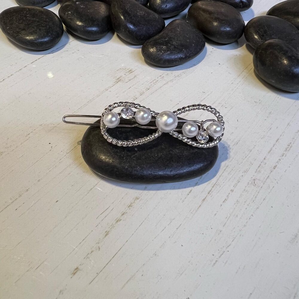 Τσιμπιδάκι μαλλιών ασημί παπιγιόν με πέρλες και διαμάντια